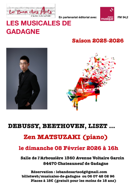Après le succès du concert de décembre du pianiste international Philippe Cassard, les Musicales poursuivent la découverte de la jeune génération du Conservatoire national supérieur de musique de Paris avec, le 8 février 2026, Zen Matsuzaki dans un répertoire de rêve : Debussy, Beethoven, Liszt...