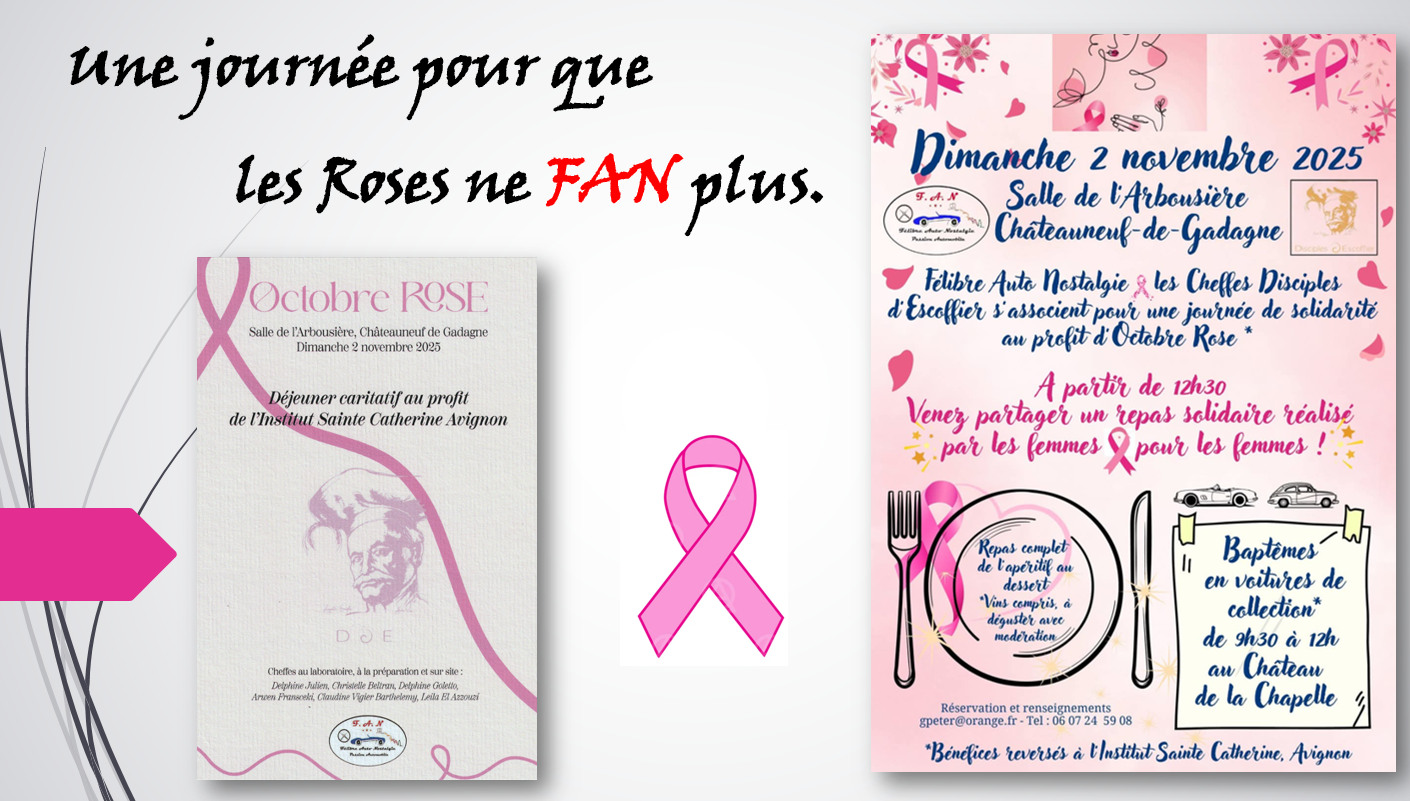 Le 2 novembre dernier, s’est déroulée l’Opération Octobre Rose organisée par 2 associations de Châteauneuf de Gadagne : Les Disciples d’Escoffier, délégation Provence-Languedoc et Félibre Auto Nostalgie. Le succès de cette manifestation, n’aurait pu être aussi retentissant sans l’aide précieuse des élus de la commune de Gadagne qui à mis à notre disposition, la salle de l’Arbousière ainsi que toute l’aide des services technique de la mairie. Un grand merci à toutes et tous, particulièrement à notre marraine Marielle FABRE et Monsieur le Maire Etienne KLEIN...
