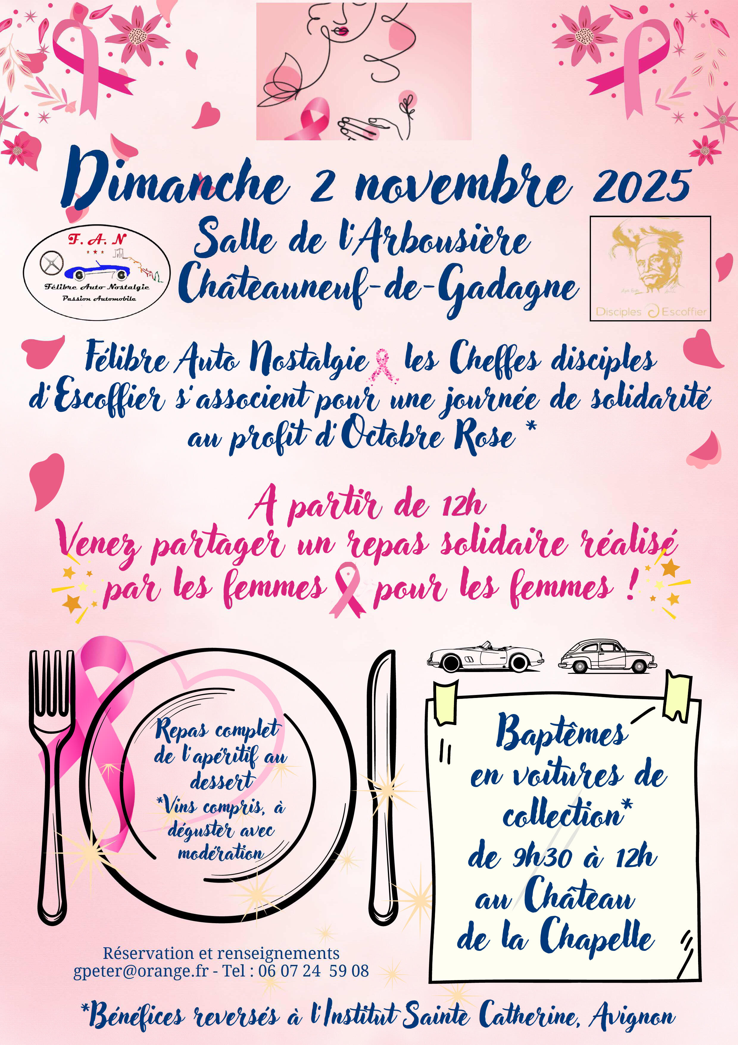 L’association Félibre Auto Nostalgie en partenariat avec l’association des Disciples d’Escoffier, organise le dimanche 2 novembre 2025, dans la cadre d’Octobre rose (opération nationale en faveur des femmes atteintes du cancer du sein), une journée solidaire au profit de l’Institut Ste Catherine, qui se déroulera en 2 temps forts distincts.