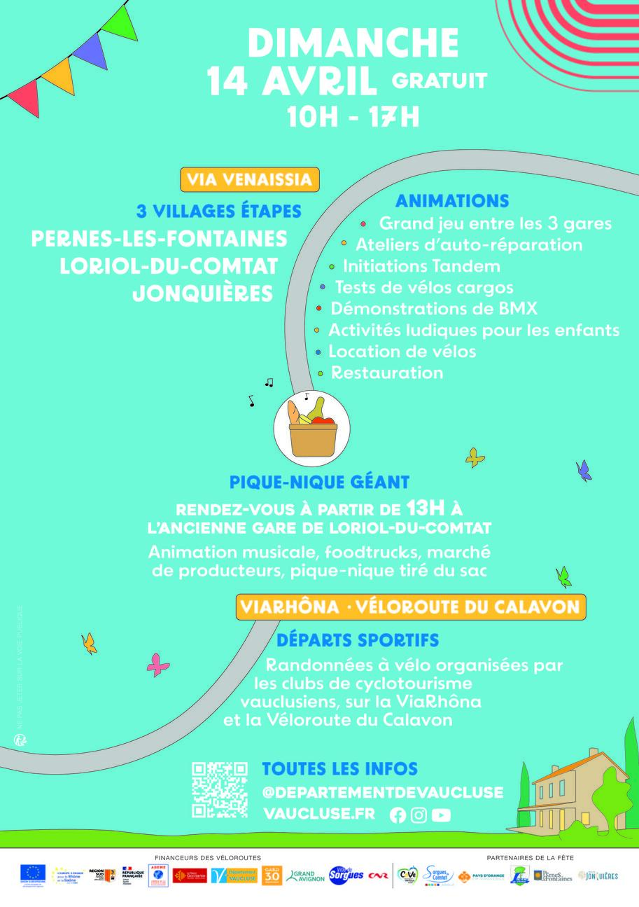 Les véloroutes départementales seront à la fête ce printemps, avec des défis sportifs sur la ViaRhôna et la véloroute du Calavon avant un grand pique-nique à la mi-journée à l'ancienne gare d'Aubignan-Loriol sur l'itinéraire de la Via Venaissia.
